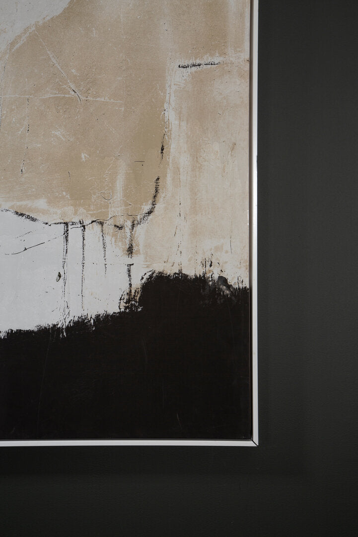 This significant piece of wall art is framed in natural wood, with a white finish and minimal design that does not overpower. Textured canvas is stretched across the frame, upon which an abstract scene is depicted in black, white, pink and natural tones.